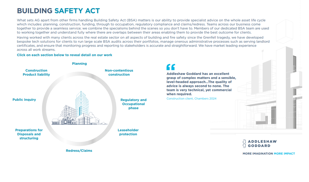 - advising on all aspects of the Building Safety Act 2022 and the new provisions in particular building liability orders, remediation contribution orders and information orders;